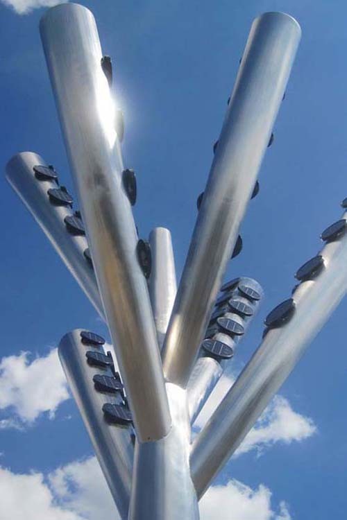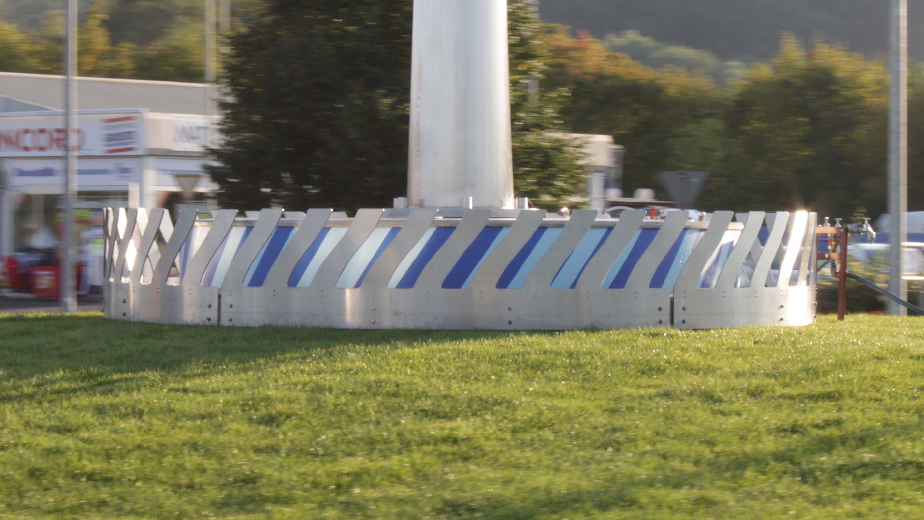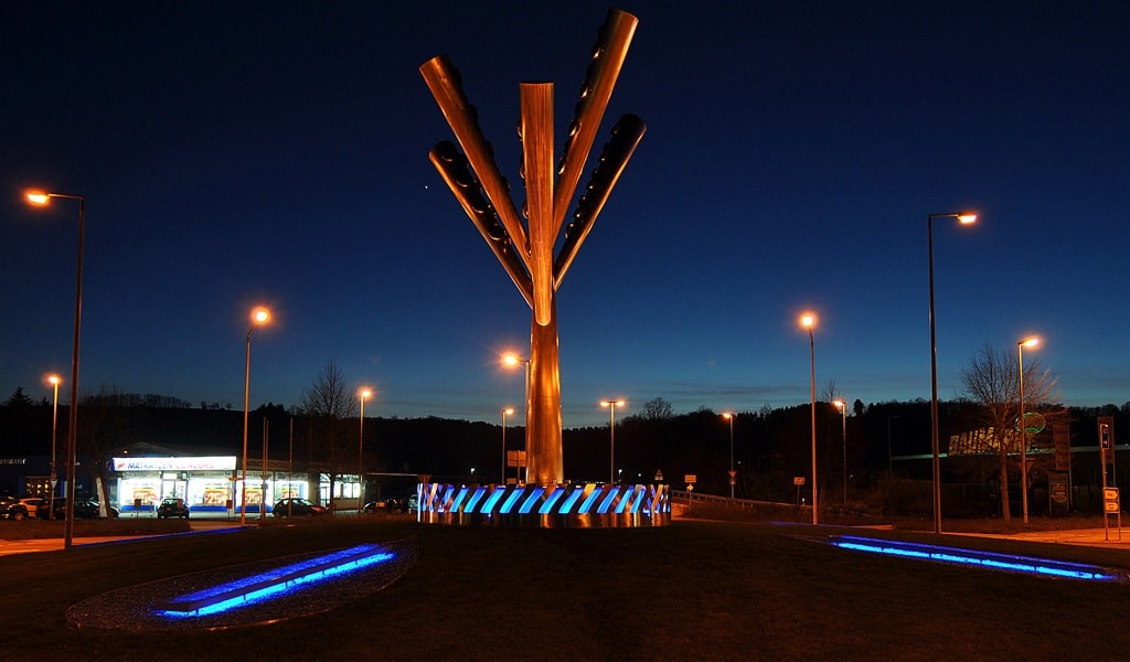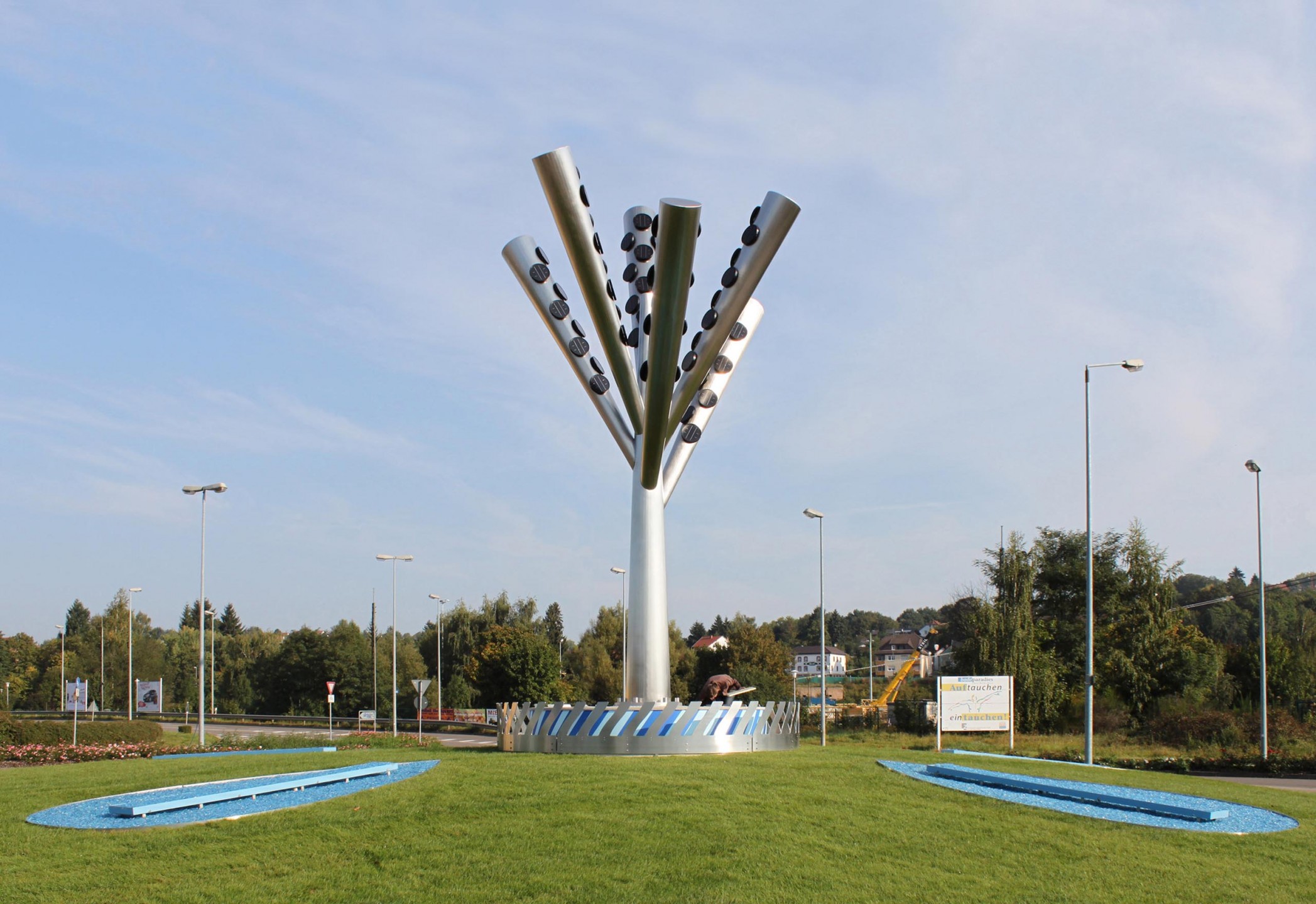 Die Energiewende von der atomaren und fossilen hin zur regenerativen Versorgung stellen die Energieversorger vor große Herausforderungen. Die Skulptur, ein Energiebaum, stellt den anstehenden Wechsel zur regenerative Energieversorgung, dem die Stadt Zweibrücken positiv und aufgeschlossen begegnet, zeichenhaft dar. Die konischen Röhren des Stammes und der äste verweisen auf die Infrastrukturen, die eine Stadt mit allem Lebenswichtigen versorgen. Das ist auch eine Referenz an den Bauherren, die Stadtwerke Zweibrückens, deren unentbehrliches, lebensnotwendiges Werk meistens unsichtbar in der Erde liegt und nun mit Wucht hier aus der Erde bricht. Die Photovoltaikpunkte auf der Skulptur erzeugen die Energie, die für die Beleuchtung der Kreiselskulptur notwendig ist. Die Sockelgestaltung der Skulptur spielt mit der Bewegung in einem Kreisverkehr, so geraten die statischen, blauen Streifen durch das Umfahren in Bewegung und symbolisieren das Wasser, mit dem die Stadtwerke Zweibrücken versorgt. Die Gestaltung bewegt sich bewusst zwischen Figurativem und Abstraktion. Sie eröffnet damit einen großen Interpretationsraum, der nicht wie etwas Figuratives vorgibt, was wahrzunehmen ist. Wir wollen das Feld für alle mögliche Interpretationen und Assoziationen freigeben, damit sich eine lebendige Diskussion über die Bedeutung der Skulptur entwickeln kann. Wir freuen uns auf den Namen, den das Objekt haben wird, dann, wenn sich eines der Bilder durchgesetzt haben wird.