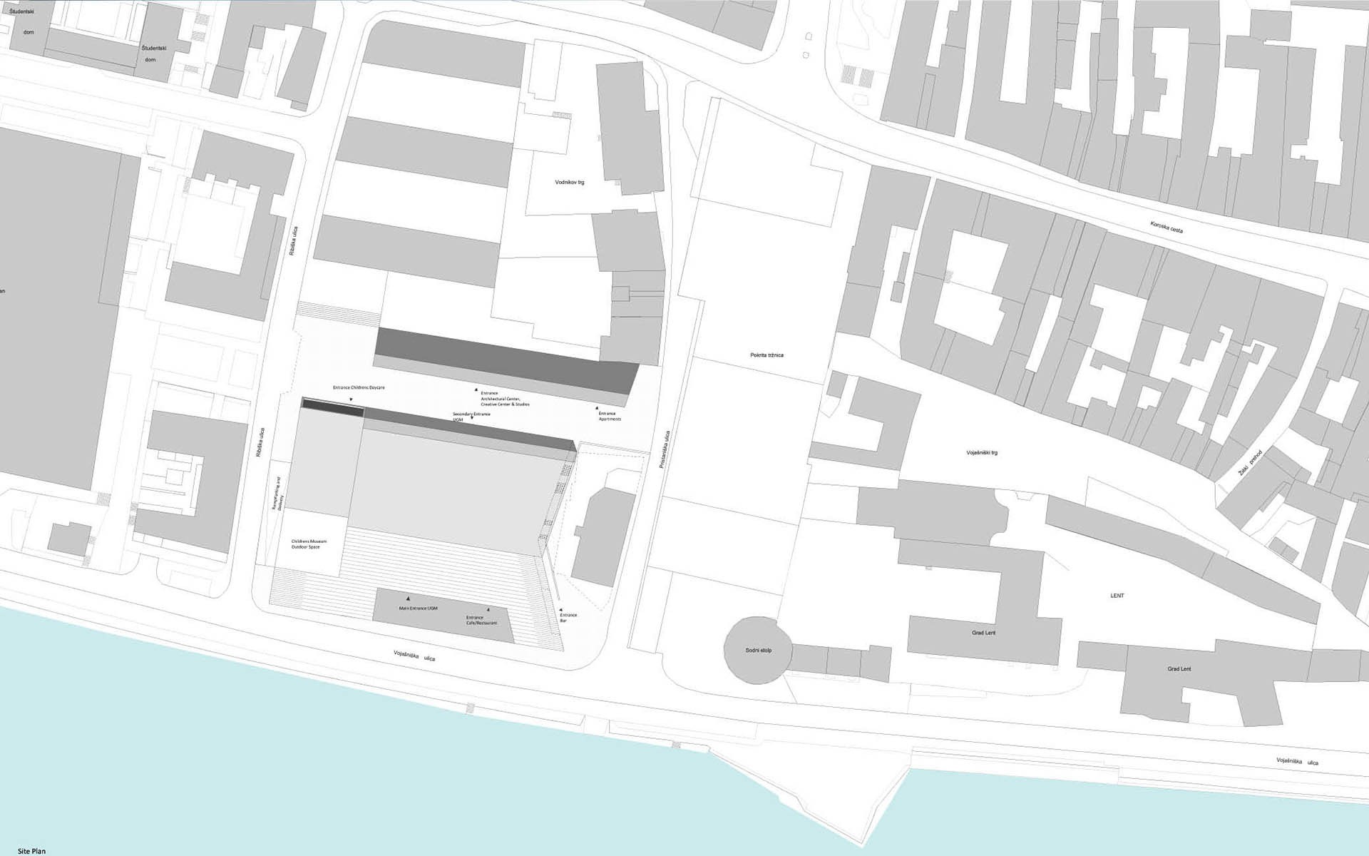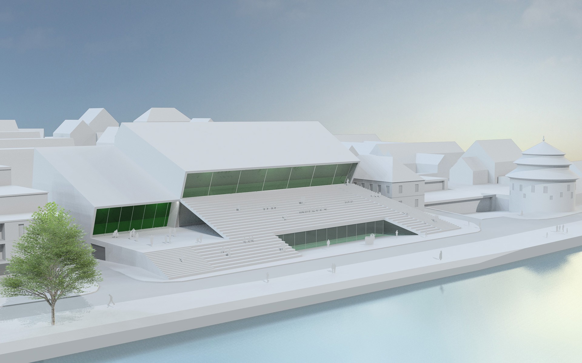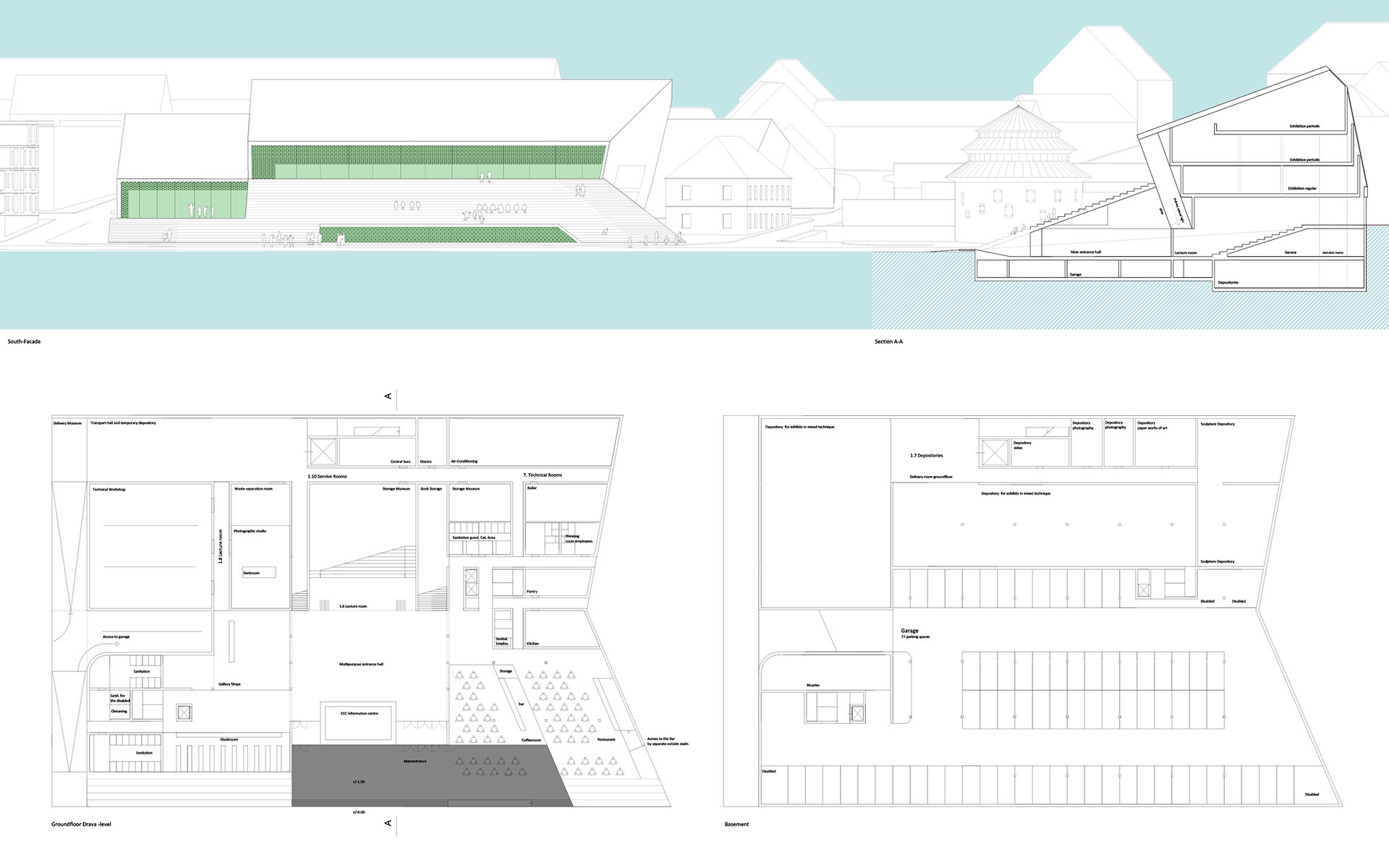 It is the stated goal of the City of Maribor that the river Drava itself should become the main event space of the city. Traditionally, the riverbank is the place where people go for a leisurely stroll, meet friends and acquaintances, dress up (or down) and maybe flirt a bit at night. Our proposal puts the Drava River literally center stage. The new Maribor Art Gallery (Umetnostna galerija Maribor - UGM) offers a public space, a large stand for the new event space: large stairs following the slope of the river bank, offering dramatic views of the river. The people of Maribor will be able to sit and enjoy the view, the sunset and the events taking place on the river and the riverbanks. This public space is to become the central meeting place for the community of Maribor, informally or otherwise, a place to talk, chat and converse, supplementing the cultural offerings inside the UGM building. The UGM building itself consists of two volumes, one big and one small, both with slanted roofs. They intend to be part the quintessential image of the city of Maribor, the beautiful roofscape made up of countless thatched roofs.
