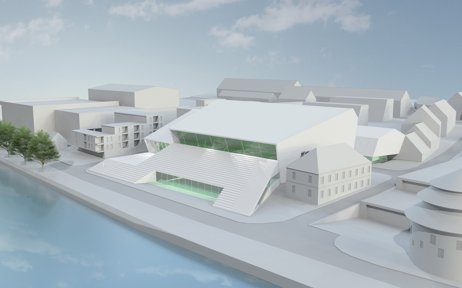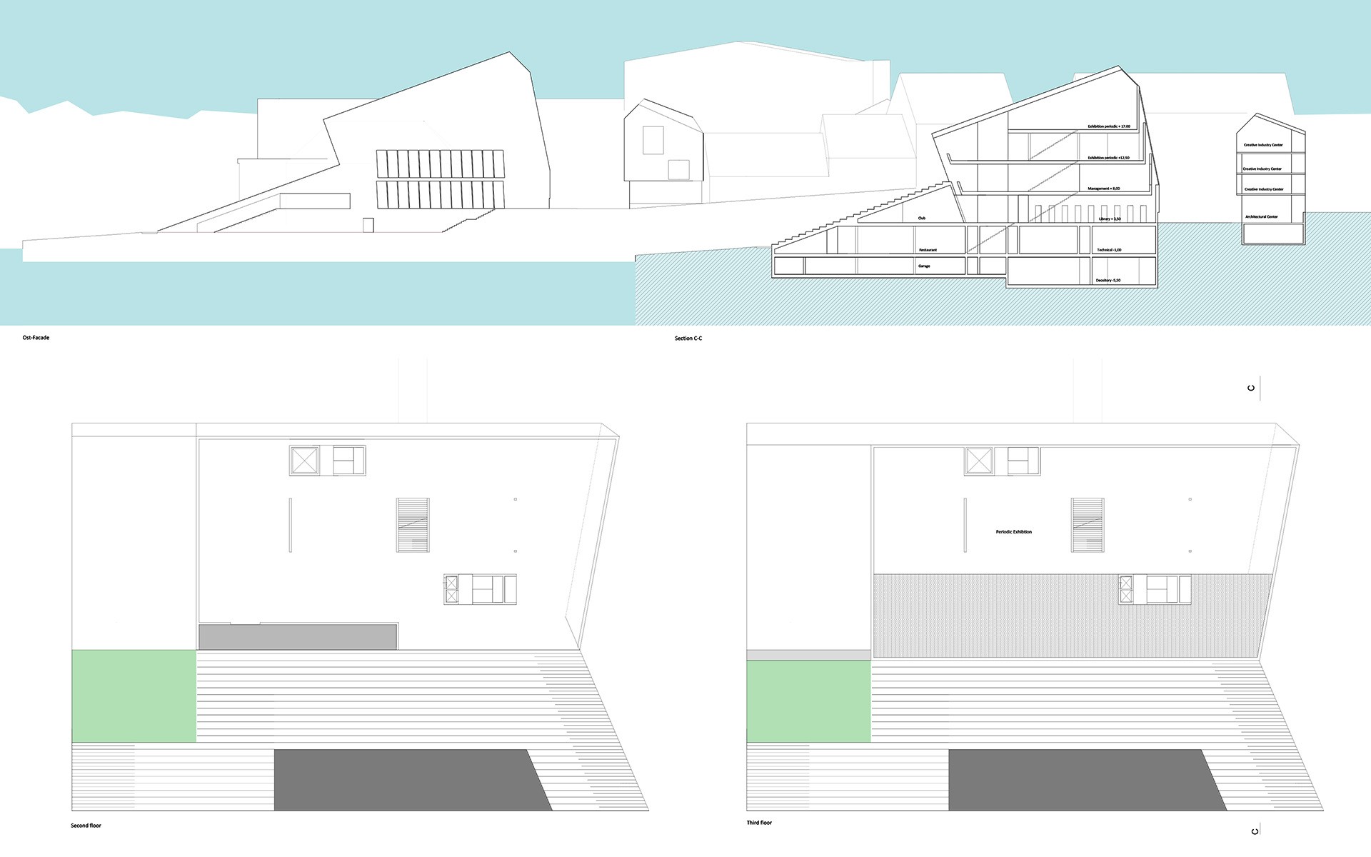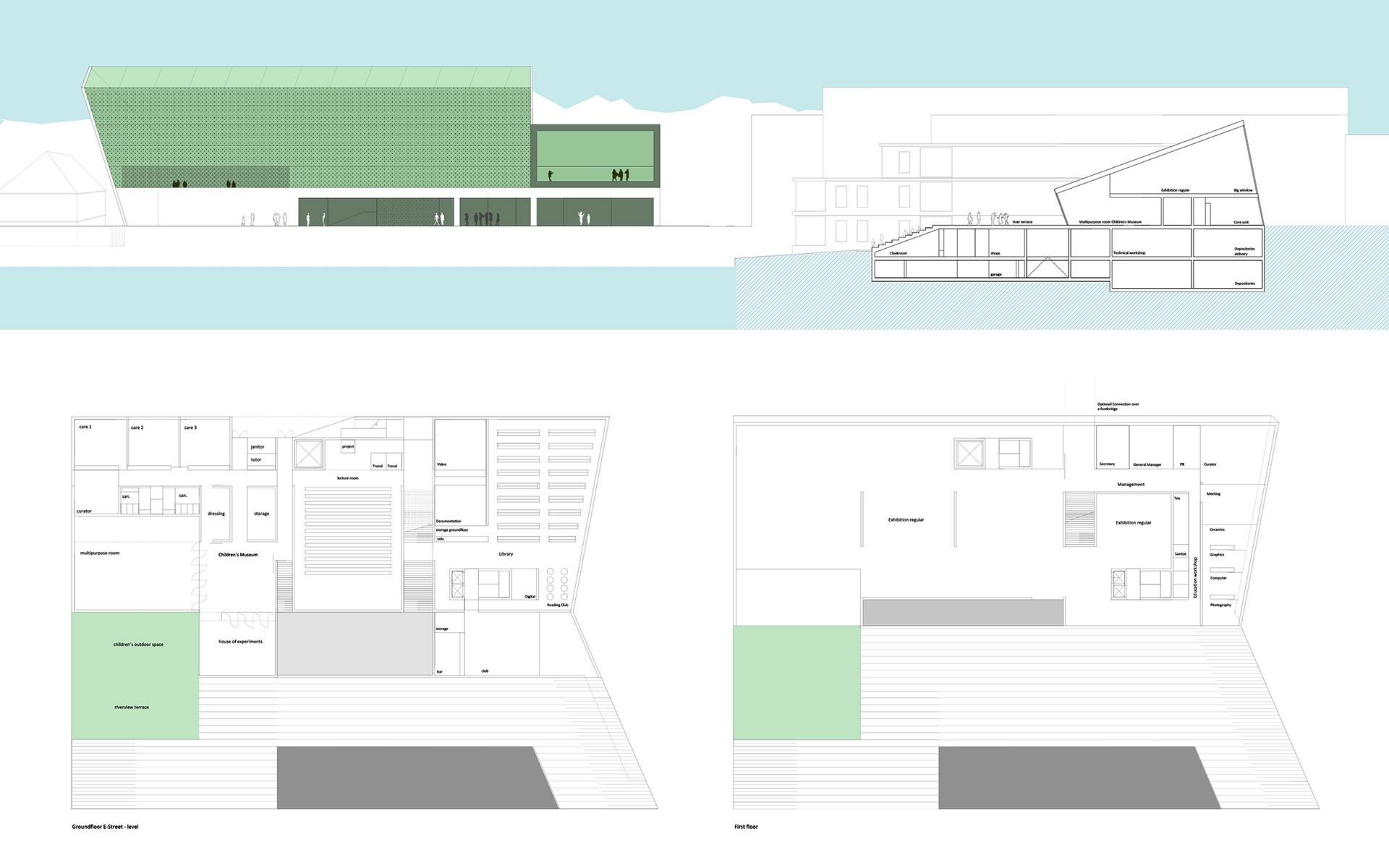 It is the stated goal of the City of Maribor that the river Drava itself should become the main event space of the city. Traditionally, the riverbank is the place where people go for a leisurely stroll, meet friends and acquaintances, dress up (or down) and maybe flirt a bit at night. Our proposal puts the Drava River literally center stage. The new Maribor Art Gallery (Umetnostna galerija Maribor - UGM) offers a public space, a large stand for the new event space: large stairs following the slope of the river bank, offering dramatic views of the river. The people of Maribor will be able to sit and enjoy the view, the sunset and the events taking place on the river and the riverbanks. This public space is to become the central meeting place for the community of Maribor, informally or otherwise, a place to talk, chat and converse, supplementing the cultural offerings inside the UGM building. The UGM building itself consists of two volumes, one big and one small, both with slanted roofs. They intend to be part the quintessential image of the city of Maribor, the beautiful roofscape made up of countless thatched roofs.